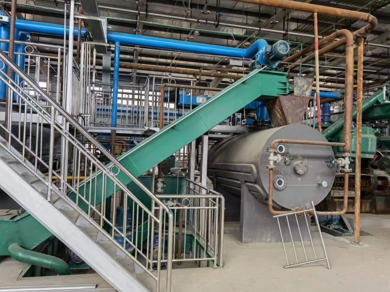 層蝶式汽提塔是國內(nèi)浸出油廠使用較多的一種汽提設(shè)備。若按照水蒸氣對混合油的汽提次數(shù),層蝶式汽提塔可分為單段式和雙段式兩種。雙段蝶式汽提塔,它主要有頂蓋、上塔體、中塔體、下塔體以及底蓋所組成。在上塔體和下塔體內(nèi)各有6-9組碟盤。每組碟盤都由滯流盤、錐形分配碟和環(huán)形分配碟組成。上、下塔體的外殼均裝有夾套,在夾套中通入343-441kPa的加熱蒸汽對塔內(nèi)的混合油進(jìn)行間接加熱。中塔體和底盤內(nèi)各有一組直接蒸汽噴入裝置。這組裝置由集油盤、導(dǎo)流管、中心管、直接蒸汽噴管組成。來自第二蒸發(fā)器的混合油,進(jìn)入層蝶式汽提塔的進(jìn)油管之后,自上而下逐次流經(jīng)每一組碟盤。到達(dá)中塔體的集油盤底的阻攔,被汽提出的溶劑蒸汽和水蒸氣繞過集油盤向上移動,而油被阻留落下。之后,混合油又沿著下塔體內(nèi)的各組碟盤逐次流下,到達(dá)底蓋內(nèi),在直接蒸汽噴入裝置中又一次被汽提,汽提出的溶劑蒸汽和水蒸氣自下而上逐級通過每一組碟盤的空隙,與碟盤表面流下的液膜狀混合油充分接觸,使混合油得到進(jìn)一步汽提。到達(dá)頂部的混合蒸汽通過出氣管進(jìn)入汽提冷凝器。經(jīng)汽提后的浸出毛油從底部的出油管通過液封裝置排出。層蝶式汽提塔結(jié)構(gòu)較為簡單,操作方便,工藝效果好。但是必須注意的:每一組碟盤的制造質(zhì)量和是否水平安裝,將影響混合油液膜的形成與氣液相接觸的面積;直接蒸汽含水,會造成毛油中磷脂的析出;直接蒸汽壓力過高或者用量過大,會形成液泛現(xiàn)象;混合油中含雜太多,則使汽提塔碟盤表面的結(jié)垢現(xiàn)象嚴(yán)重,毛油質(zhì)量降低;若采用多段式,應(yīng)使上層直接蒸汽壓力低于下層。直接蒸汽好采用低壓過熱蒸汽。層蝶式汽提塔在檢修時碟盤的清理比較麻煩。